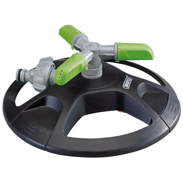 Manufactured from impact-resistant plastic. 3 arm revolving plastic sprinkler with 33cm diameter plastic base. The adjustable arms enable changing angles for pattern, speed and coverage up to a radius of 5.8M. Fitted with a ground spike ensuring sprinkler stability.