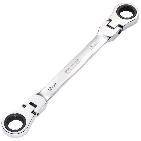 This Draper HI-TORQ® metric flexible head ratchet combination spanner is forged from chrome vanadium steel that is hardened, tempered, fully polished and mirror chrome plated for corrosion protection.