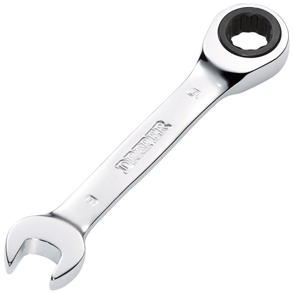 This Draper HI-TORQ® metric stubby ratchet combination spanner is forged from chrome vanadium steel that is hardened, tempered, fully polished and mirror chrome plated for corrosion protection.