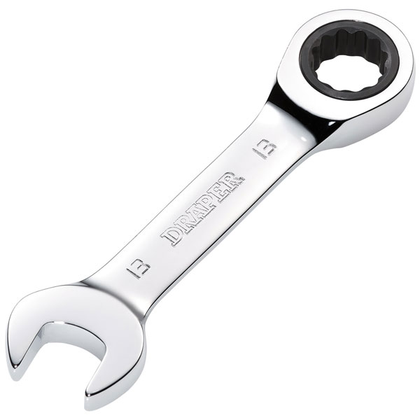 This Draper HI-TORQ® metric stubby ratchet combination spanner is forged from chrome vanadium steel that is hardened, tempered, fully polished and mirror chrome plated for corrosion protection.
