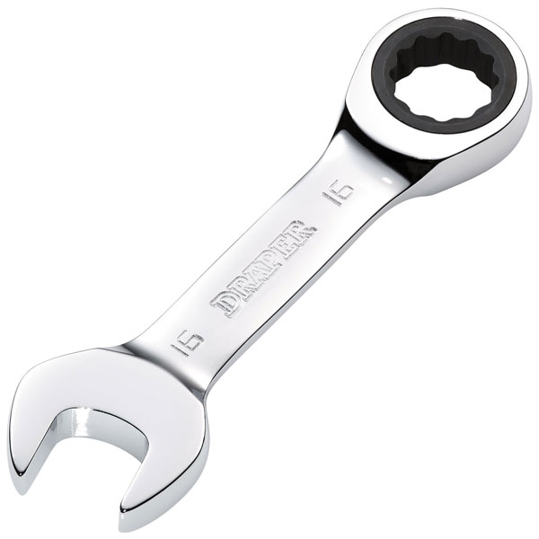 This Draper HI-TORQ® metric stubby ratchet combination spanner is forged from chrome vanadium steel that is hardened, tempered, fully polished and mirror chrome plated for corrosion protection.