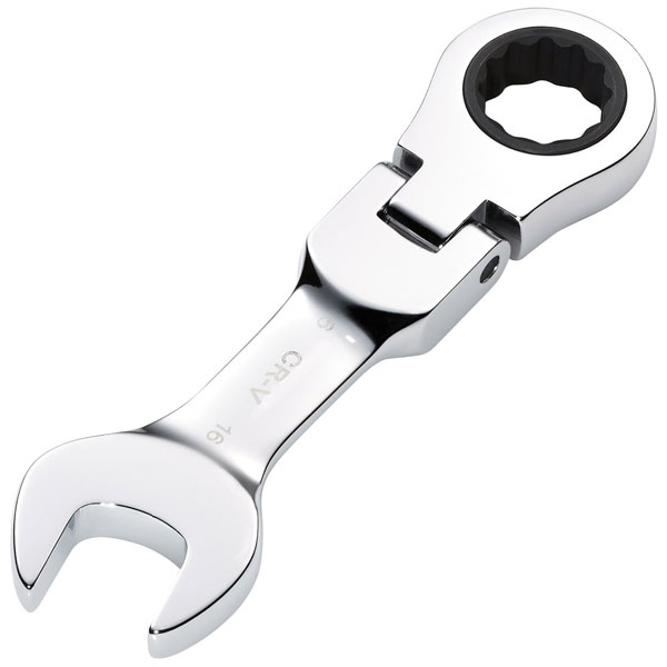 This Draper HI-TORQ® metric stubby flexible head ratchet combination spanner is forged from chrome vanadium steel that is hardened, tempered, fully polished and mirror chrome plated for corrosion protection.