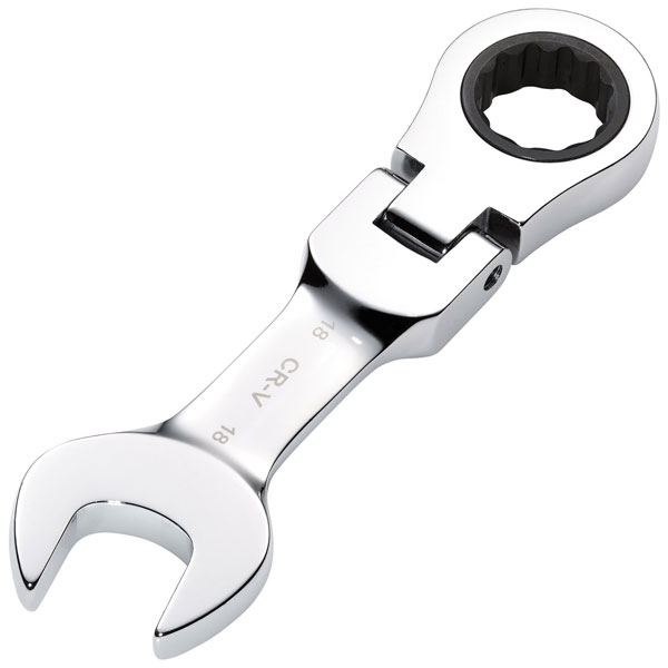 This Draper HI-TORQ® metric stubby flexible head ratchet combination spanner is forged from chrome vanadium steel that is hardened, tempered, fully polished and mirror chrome plated for corrosion protection.