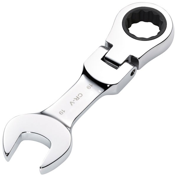 This Draper HI-TORQ® metric stubby flexible head ratchet combination spanner is forged from chrome vanadium steel that is hardened, tempered, fully polished and mirror chrome plated for corrosion protection.
