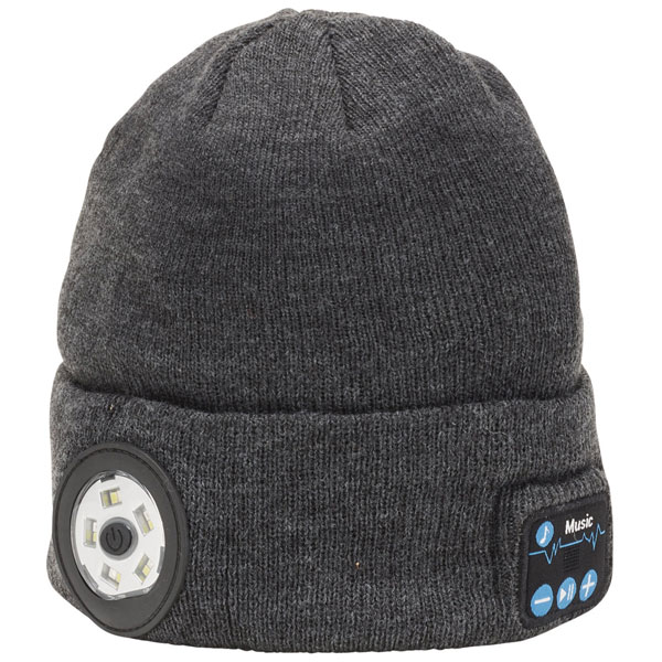 This smart grey beanie hat has a built-in head torch and wireless headset and microphone, for listening to music and making telephone calls.