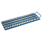 1/4", 3/8" and 1/2" square drive socket carrier made from pressed steel plate with fold down carrying handle. 430mm long socket retaining bars manufactured from carbon steel hardened and tempered with a polished finish. Display carton.