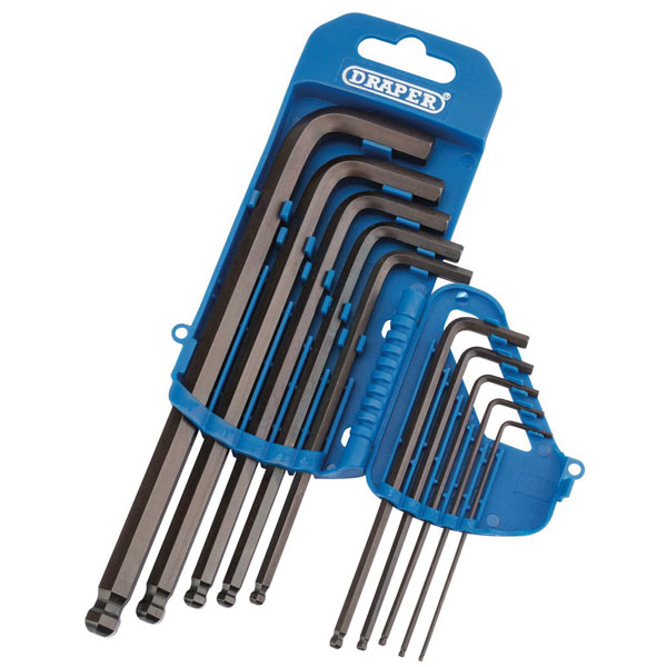 Hexagon keys with ball end on the long arm and conventional ends on short arm. The ball type hexagon tip allows the hexagon key to be used up to 30° angle from the screwhead recess. Manufactured from chrome vanadium steel that's hardened and tempered. Held in plastic storage holder.
