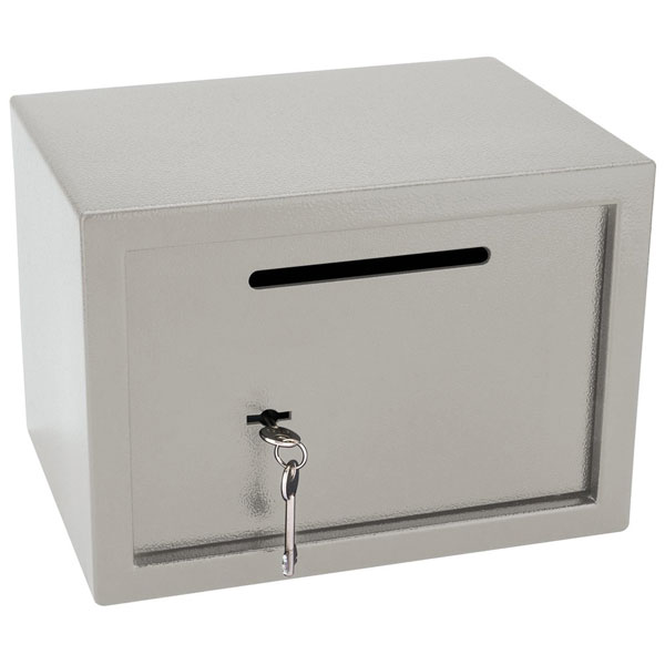 Solid steel safe with posting slot which allows credit cards, letters and documents to be put into safe when closed. Safe has pre-drilled holes and supplied with security fixings and two keys. Display carton.