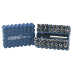 A security bit set and holder comprising a selection of 25mm long 1/4" insert security bit types generally available on the market. The Draper TX-STAR and hexagonal bits have a hole drilled in the bit to take the pin of the security fixing. Packed in a handy plastic storage case.