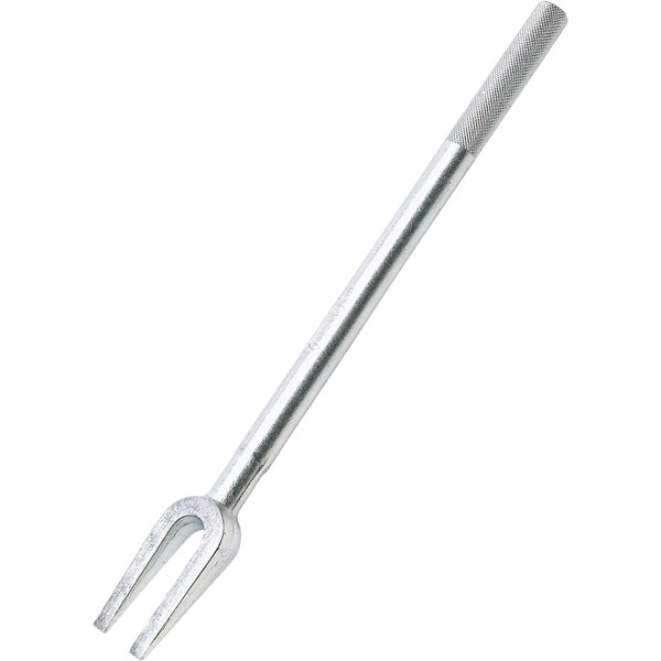 A long reach fork type ball joint splitter with a forged carbon steel body and a plated finish.