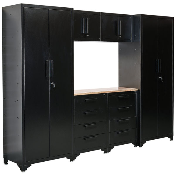 This complete steel storage unit combines two tall cabinets - each with two doors and three fitted shelves, two wall cabinets, two base cabinets with four drawers and a pressed wood worktop.