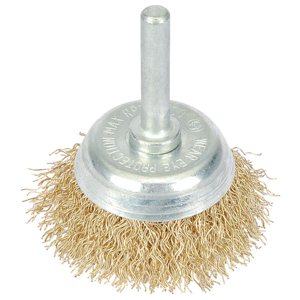 A wire cup brush with brassed crimped steel wire.
