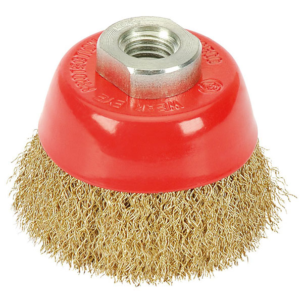 A crimped wire cup brush designed for use with an angle grinder with an M14 thread.
