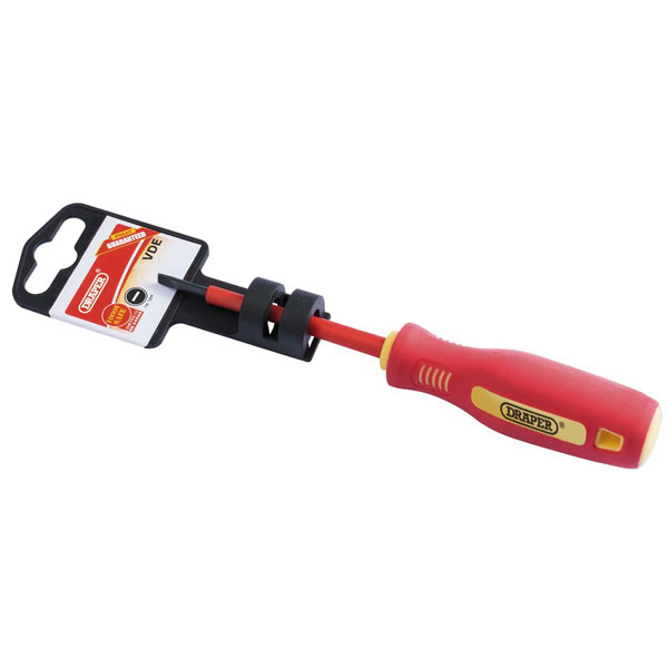 VDE approved fully insulated soft grip plain slot screwdrivers tested to 10kV, suitable for working on live circuits up to 1kV AC and 1.5kV DC. Made from hardened, tempered and chemically blacked S2 steel. Display packed on individual storage hanger.