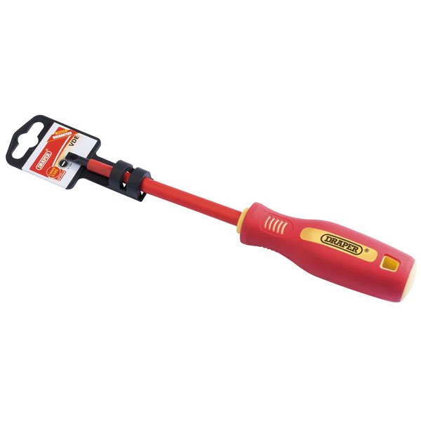 VDE approved fully insulated soft grip plain slot screwdrivers tested to 10kV, suitable for working on live circuits up to 1kV AC and 1.5kV DC. Made from hardened, tempered and chemically blacked S2 steel. Display packed on individual storage hanger.