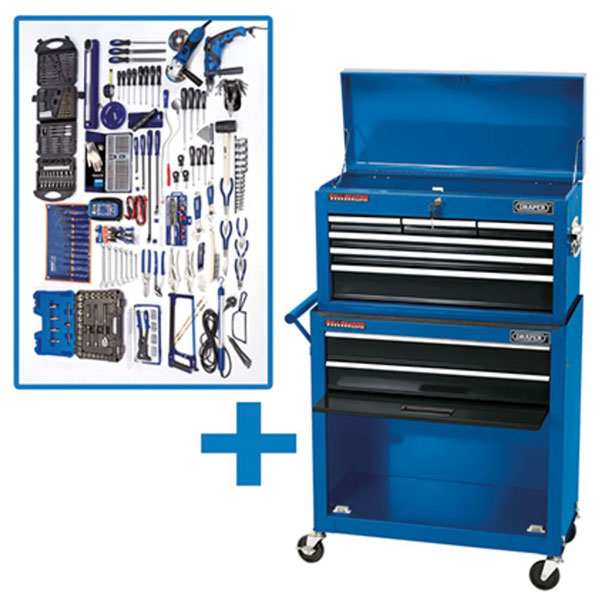 Comprises combined roller cabinet chest (size 616 x 330 x 1080mm) with a selection of tools suitable for use in the workshop.