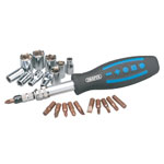 Extending flexible shaft with 1/4" bit holder. The set is supplied with 19 bits x 25mm long manufactured from chrome vanadium steel hardened and tempered with an antique brass finish. Flexible shaft can be used in the closed position or extended 200mm for applications in awkward locations. Display packed in blow mould case with window lid.