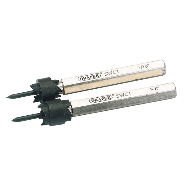 Set of two spot weld cutters to drill out welds on body panels. Pilot drill ensures accurate cut. Cutters screw onto hexagon shank and are reversible for extra long life. Shank size 7mm. Display packed.