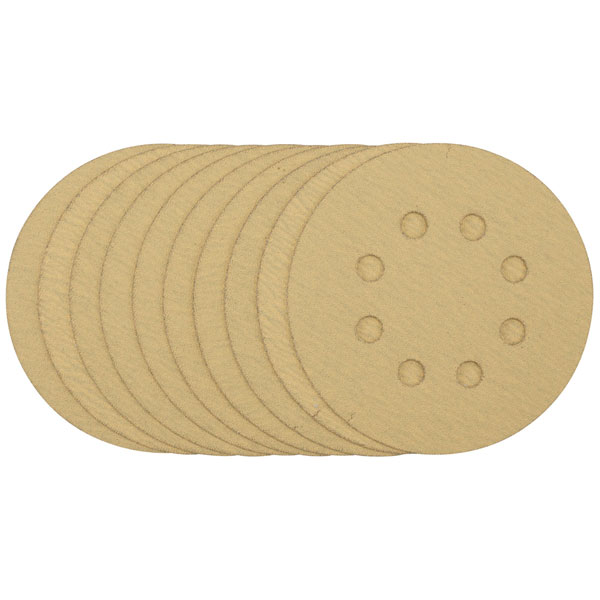 Pack of 10 gold sanding discs made from aluminium oxide with a special treatment of calcium stearate which is resin bonded to provide self-sharpening and anti-clogging performance.