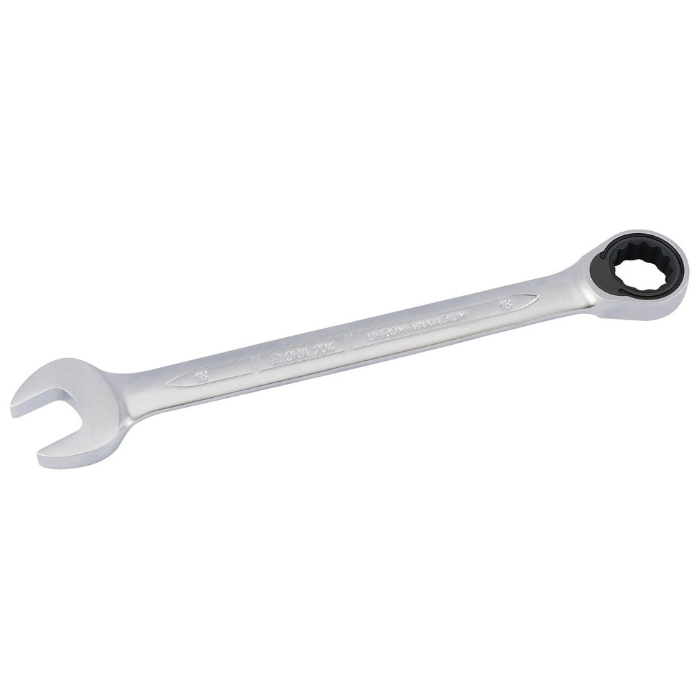 Open end set at 15�. ELO-Drive ring end manufactured with 72 teeth ratcheting mechanism - only 5� movement required to turn fastener, especially useful in confined spaces. Forged from chrome vanadium steel, hardened, tempered and matt chrome plated.