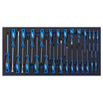 Screwdrivers manufactured from chrome vanadium steel, which is correctly hardened and tempered with a satin chrome plated sand blasted finish. Fitted with soft grip handles for enhanced user comfort. Supplied complete in a two tone full drawer EVA insert tray made from closed cell foam. Suitable to be used in Draper and Draper Expert tool chests and other manufacturers similar tool chests.