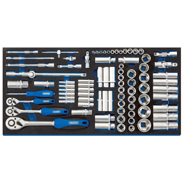 Manufactured from chrome vanadium steel, which is correctly hardened and tempered with a satin chrome plated finish. Each socket has a knurled ring for extra grip. Supplied with 72 tooth reversible soft grip ratchet and accessories. Supplied complete in a two tone full drawer EVA insert tray made from closed cell foam. Suitable to be used in Draper and Draper Expert tool chests and other manufacturers similar tool chests.