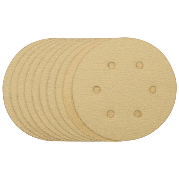 Pack of 10 gold sanding discs made from aluminium oxide with a special treatment of calcium stearate which is resin bonded to provide self-sharpening and anti-clogging performance.