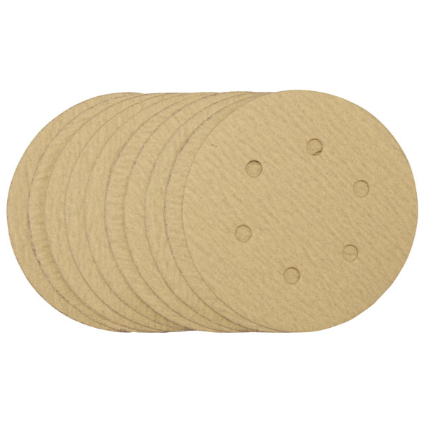 Pack of 10 gold sanding discs made from aluminium oxide with a special treatment of calcium stearate which is resin bonded to provide self-sharpening and anti-clogging performance.