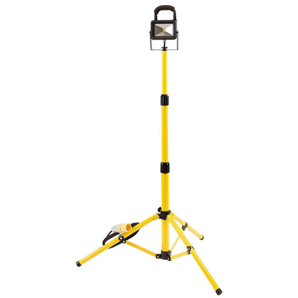 Ultra thin flood lights on an adjustable tripod. Incorporating COB LED technology, which provides the unit with a highly efficient super bright lumen output. The light housing is made from cast Aluminium with a toughened glass lens, and attached to a steel tube floor stand with foam handle, all manufactured to IP65 specifications making them suitable for external use. Supplied complete with 3M cable and plug.