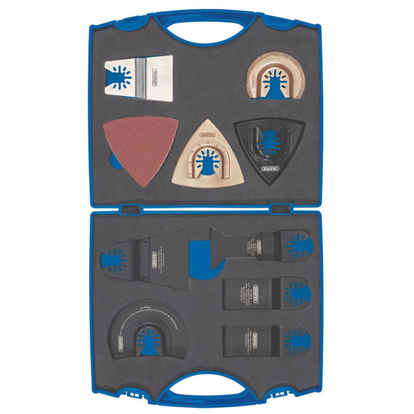 20-piece set comprising of the most popular oscillating multi-tool blades. Designed for cutting ferrous and non-ferrous metal, wood, plastic and plasterboard. There is also a scraper and blades included for removing grout and mortar. The sanding sheets are suitable for a wide range of surfaces. Universal fitting for use with Draper and other manufacturers’ oscillating multi-tools.
