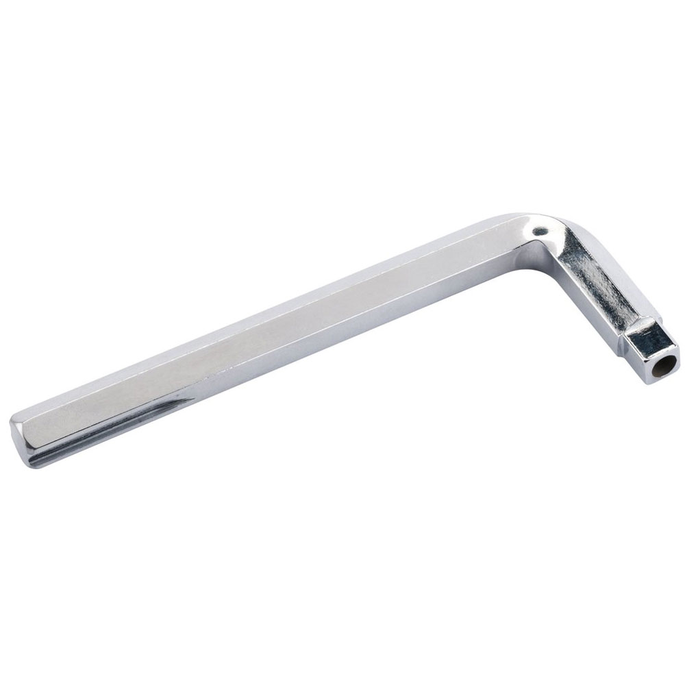 Chrome plated hexagon key with square on short arm and two flutes on the 1/2" end of the long arm. Display packed.