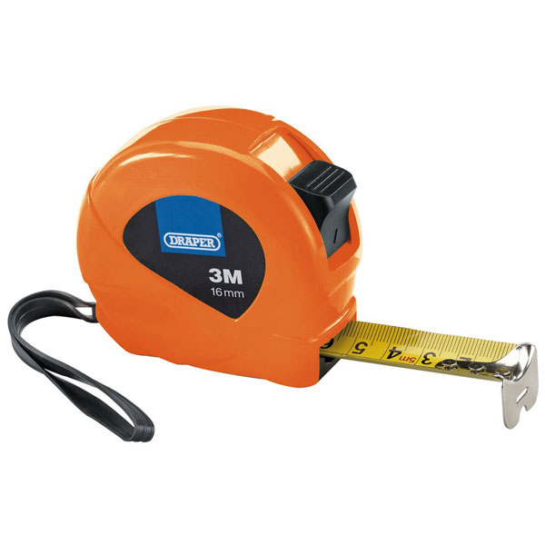Brightly coloured plastic tape cases with locking button. Power return blade with clear graduations, metres into cm/mm and feet into inches, 1/8", 1/16" and 1/32". The self-aligning end hook helps deliver accurate internal and external measurements. Supplied in three colours (Green, Orange, Yellow) in a countertop display.