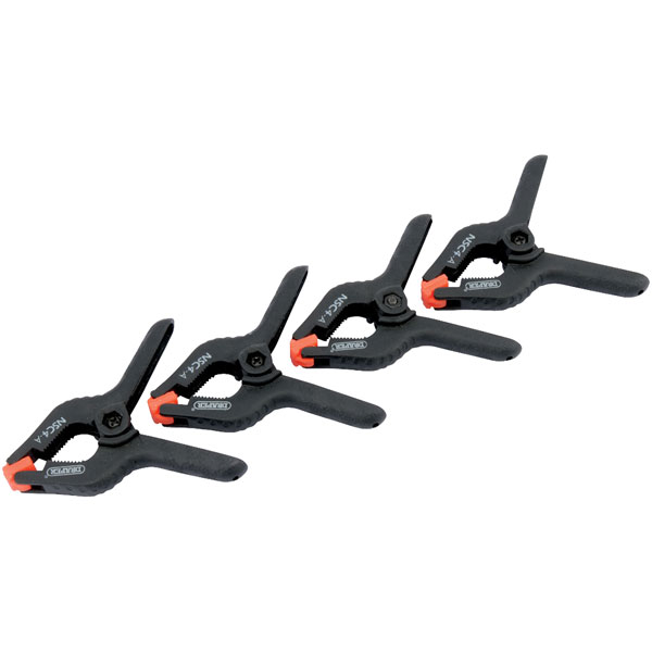 Multiple use clamps for domestic use. Heavy spring with swivelling jaw ends to accommodate different shapes, sizes and surfaces. Tough durable plastic. Carton packed.