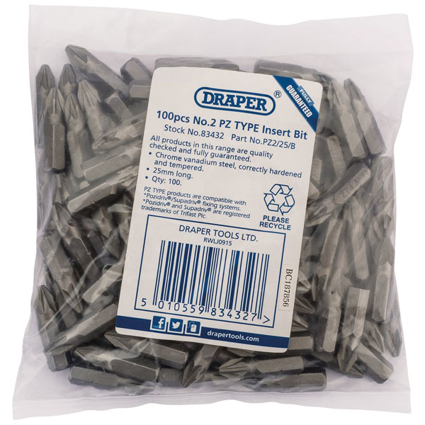 Draper 83432 No.2 PZ TYPE 1/4" Insert Bits (Bag of 100)