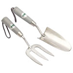 The ideal gift set comprising stainless steel weeding fork and stainless steel hand trowel. Fixed to a plastic handle attached with a leather wrist strap. Attractively packaged in window display box.