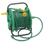 Tubular steel frame with tough plastic drum with wind-up handle. Flow through design with 1/2" hose connector. Supplied complete with 30M of 12mm hose and five pattern spray gun. Display carton.