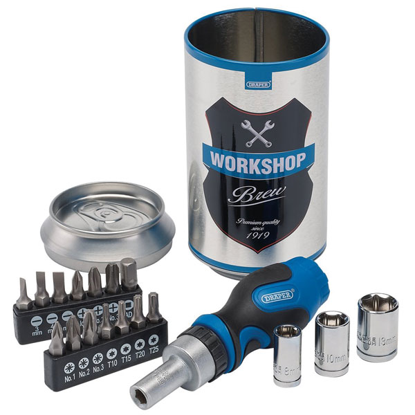 Special edition screwdriver and bit set. Stubby ratchet screwdriver plus range of metric 1/4" sockets and 25mm CRV insert bits. Screwdriver shaft manufactured from carbon steel. Forward and reverse with locking action and 1/4" magnetic bit holder.
