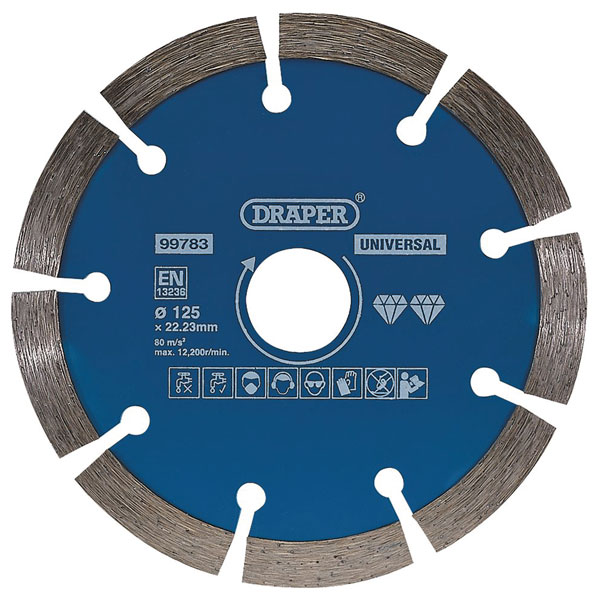 Hardened and tempered diamond blade with segmented rim for a faster cut. General purpose blade for use on concrete, bricks, stone, granite and marble. Suitable for dry and wet cutting, with optimum results when used wet. Compatible with most angle grinders with a 22.23mm bore.