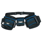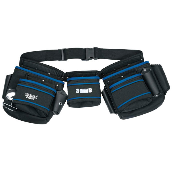 Expert Quality, rigid nylon, reinforced with rivets. Comprises two large pouches, three smaller pouches, measuring tape clasp, hammer loop, four leather tool holders and nylon tool holder. Supplied with 50mm fully adjustable fast click webbing belt. Display carton.