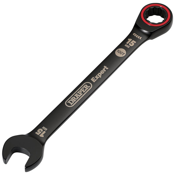 This 15mm Draper Expert HI-TORQ® metric ratchet combination spanner is manufactured from hardened and tempered chrome vanadium steel, with black electroplating for corrosion protection.