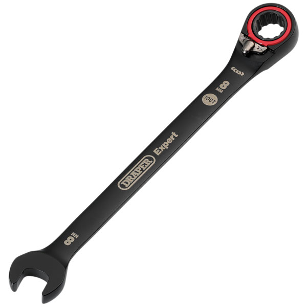 This 8mm Draper Expert HI-TORQ® metric reversible ratchet combination spanner is manufactured from hardened and tempered chrome vanadium steel, with black electroplating for corrosion protection.