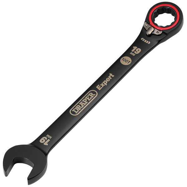 This 19mm Draper Expert HI-TORQ® metric reversible ratchet combination spanner is manufactured from hardened and tempered chrome vanadium steel, with black electroplating for corrosion protection.