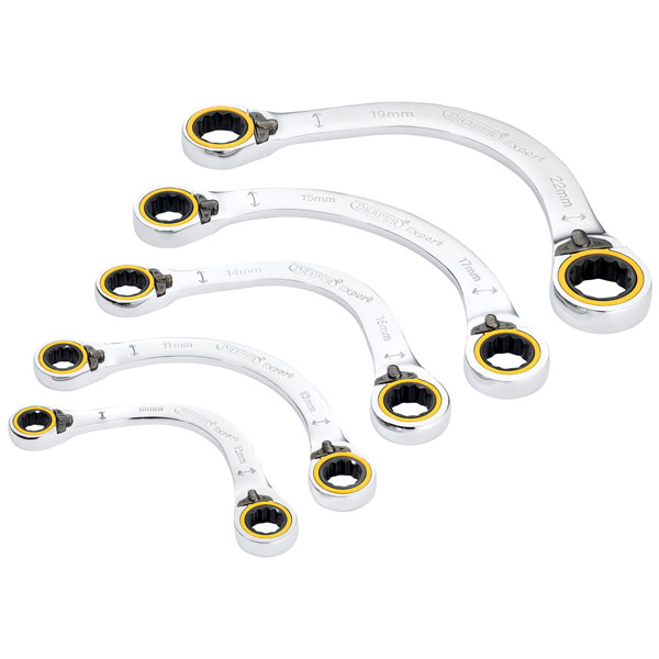 The Draper Expert HI-TORQ® double ring ratchet half moon spanners in this five-piece set are manufactured from hardened and tempered chrome vanadium steel, with a mirror chrome plate finish for corrosion protection.