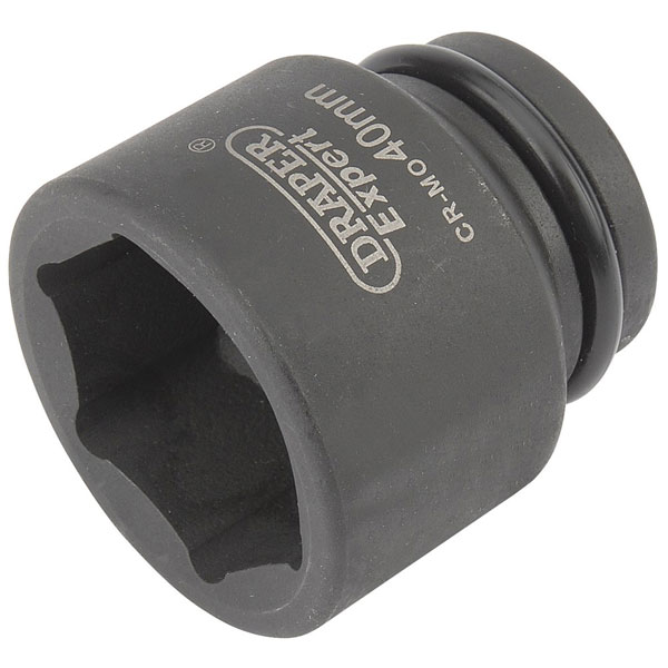 Expert Quality, 6 point sockets forged from chrome molybdenum hardened, tempered and chemically blacked for corrosion protection. Supplied with pin and ring. These sockets are for use with air, electric or manual impact wrenches. Packed in polythene bag with barcode.