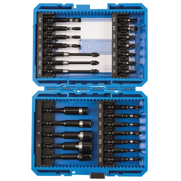 Expert Quality 1/4" hex impact screwdriver bit set, manufactured from S2 steel, correctly hardened and tempered with a phosphate finish. Designed for use with impact drivers. Supplied in a plastic case with soft grip detail.