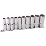 Expert Quality set of 12 point deep sockets, manufactured from chrome vanadium steel hardened, tempered, chrome plated and polished for corrosion protection. Chamfered end allows positive nut location. Overall lengths; 80mm. Display packed.