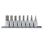 Expert Quality, 8 sockets fitted with hexagonal bits. All sockets manufactured from hardened and tempered chrome vanadium steel with sand blasted bits of S2 silicon steel. Each socket has a knurled ring for extra grip. Supplied on a steel socket retaining rail. Display packed.