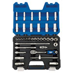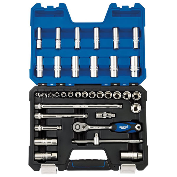Expert Quality, six point sockets made from chrome vanadium steel that's hardened and tempered with a micro satin finish. Each socket has a knurled ring for extra grip. Supplied with a 72 tooth reversible soft grip ratchet and accessories. Packed in a tough plastic storage case with soft grip handle.