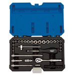 Expert Quality, 6 point sockets made from chrome vanadium steel that's hardened and tempered with a polished finish. Each socket has a knurled ring for extra grip. Supplied with a 72 tooth reversible ratchet and accessories. Packed in tough plastic storage case.