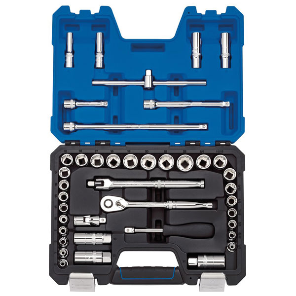 Expert Quality, twelve point sockets made from chrome vanadium steel that's hardened and tempered with a polished finish. Each socket has a knurled ring for extra grip. Supplied with a 72 tooth reversible ratchet and accessories. Packed in a tough plastic storage case with soft grip handle.